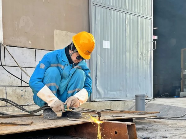 卡爾希海螺維修工貝克正在進行鋼材下料作業(yè),他說:“Payvandchi qo‘lidagi yong‘in – uskunaning barqaror ishlashining kafolati.(用我手中的焊槍,保障設(shè)備穩(wěn)定運行)”