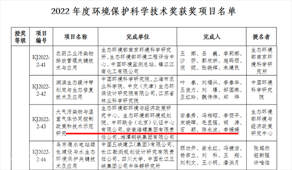 ●《大氣污染物與溫室氣體協(xié)同控制政策和技術(shù)示范研究》獲評(píng)2022年度環(huán)境保護(hù)科學(xué)技術(shù)獎(jiǎng)二等獎(jiǎng)