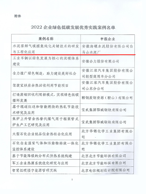 2022年12月,中國(guó)企業(yè)聯(lián)合會(huì)、中國(guó)企業(yè)家協(xié)會(huì)發(fā)布《關(guān)于發(fā)布“2022企業(yè)綠色低碳發(fā)展優(yōu)秀實(shí)踐案例”的通知》《關(guān)于入選“2022企業(yè)綠色低碳發(fā)展優(yōu)秀實(shí)踐案例”的告知函》。集團(tuán)公司牽頭組織白馬山水泥廠《水泥窯煙氣碳捕集純化關(guān)鍵技術(shù)的研發(fā)與工程化應(yīng)用》、全椒海螺《水泥生產(chǎn)全流程智能制造關(guān)鍵技術(shù)》均獲選“優(yōu)秀實(shí)踐案例”。