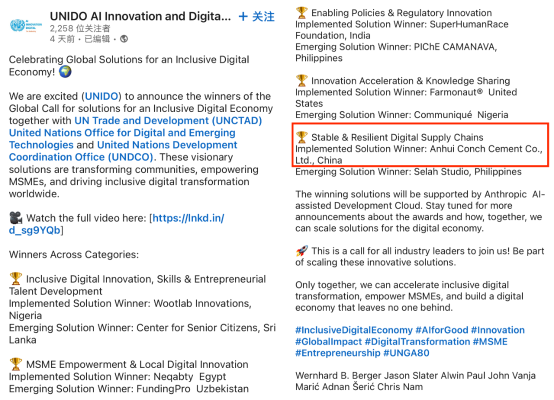 近日,海螺集團下屬“安徽海螺水泥股份有限公司——海螺云工大模型”在聯(lián)合國工業(yè)發(fā)展組織等機構于2025年7月發(fā)起的“2025包容性數(shù)字經(jīng)濟全球解決方案征集”中,榮獲: 穩(wěn)定與韌性的數(shù)字供應鏈 類別 最佳實施方案獎 獎項。