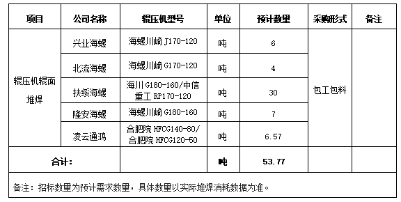 為拓寬采購渠道,提高采購質(zhì)量,本著“公開、公平、公正”的競爭原則,廣西區(qū)域六家公司(興業(yè)海螺、北流海螺、扶綏海螺、隆安海螺以及凌云通鴻)擬對2022年水泥磨輥壓機(jī)輥面堆焊進(jìn)行聯(lián)合招標(biāo),選擇經(jīng)營能力較好、經(jīng)營資質(zhì)合格、保供和服務(wù)能力較強(qiáng)的廠家和耐磨焊絲生產(chǎn)或供應(yīng)單位,歡迎具備條件的廠家和單位參加,現(xiàn)將有關(guān)事項(xiàng)公示如下: