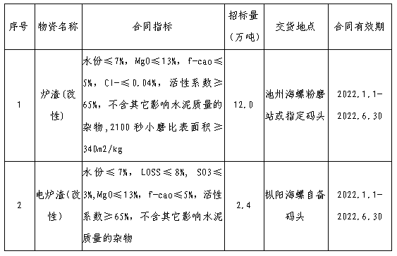 根據(jù)池州、樅陽公司水泥生產(chǎn)經(jīng)營(yíng)需求,安徽池州海螺水泥股份有限公司、安徽樅陽海螺水泥股份有限公司將對(duì)2022年1月1日-2022年6月30日合同期爐渣(改性)開展采購招標(biāo)工作,為進(jìn)一步體現(xiàn)公開、公平、公正的原則,現(xiàn)將相關(guān)事宜公告如下: