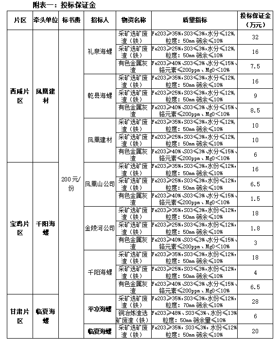 根據(jù)2022年度禮泉海螺、平?jīng)龊B?、千陽海螺、乾縣海螺、臨夏海螺、鳳凰建材、金陵河公司、鳳凰山公司等8家公司生產(chǎn)經(jīng)營計劃,現(xiàn)對2022年度鐵質(zhì)材料(直供)采購組織招標(biāo),為進(jìn)一步體現(xiàn)公平、公正、公開透明的原則,此次招標(biāo)將在安徽海螺水泥股份有限公司陽光采購平臺公開進(jìn)行,現(xiàn)將招標(biāo)采購信息發(fā)布如下: