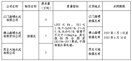 安徽海螺水泥股份有限公司廣東區(qū)域下屬的佛山、江門海螺、茂名大地三家公司擬對粉煤灰采購進行聯(lián)合公開招標,為進一步體現(xiàn)公平、公正、公開的原則,拓寬采購渠道,提高采購質量,現(xiàn)將相關事宜公告如下: