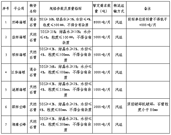 5、投標(biāo)雙峰海螺混合石膏的單位投標(biāo)量不得低于4000噸/月,否則為廢標(biāo)。
