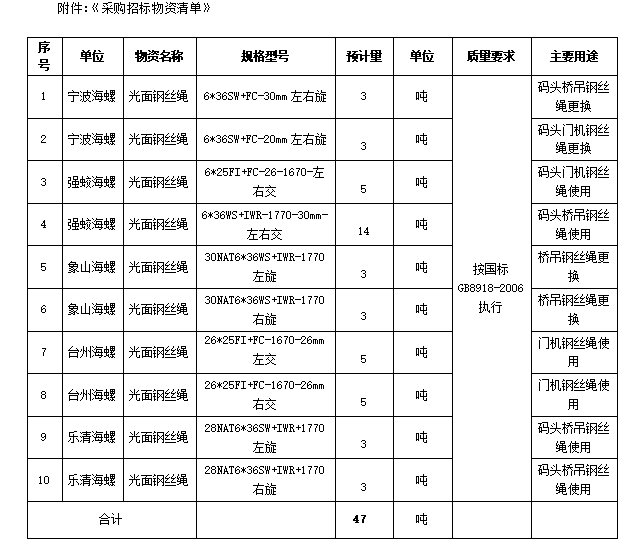 2022年度浙江區(qū)域五家子公司(寧波海螺、象山海螺、強蛟海螺、臺州海螺、樂清海螺)因生產維修需要,需對碼頭門機及日常生產所用鋼絲繩進行招標。為進一步體現公平、公正、公開的原則,拓寬采購渠道,提高采購質量,現將相關事宜公告如下: