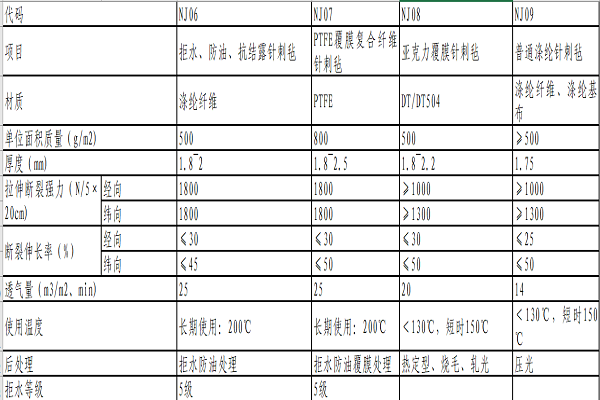 (1)濾袋的材質(zhì):濾袋應(yīng)采用在強(qiáng)度、耐熱、抗化學(xué)物質(zhì)和熱膨脹、抗結(jié)露、防水等性能方面優(yōu)良的材質(zhì);窯尾濾料表面須有PTFE覆膜,具備良好的抗水份,抗酸堿性能,壓差阻力小;煤磨濾料具有良好的抗靜電和阻燃性能。