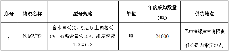 為進(jìn)一步提升鐵尾礦砂采購(gòu)招標(biāo)的公平、公正、公開(kāi)透明性,根據(jù)巴中海螺建材(商混)生產(chǎn)需求情況,現(xiàn)組織開(kāi)展鐵尾礦砂公開(kāi)招標(biāo),特將招標(biāo)事宜公告如下: