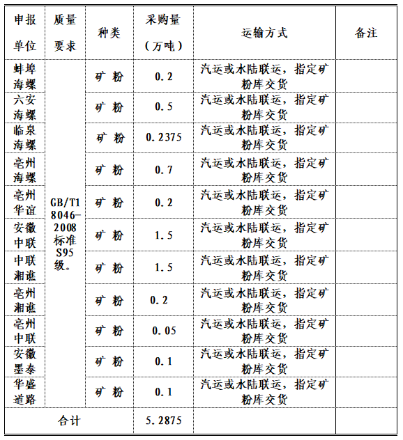2.交貨地點(diǎn):蚌埠海螺、六安海螺、臨泉海螺、亳州海螺、亳州華誼、安徽中聯(lián)、中聯(lián)湘譙、亳州湘譙、亳州中聯(lián)、安徽墨泰、華盛道路十一家公司指定礦粉庫(kù)。