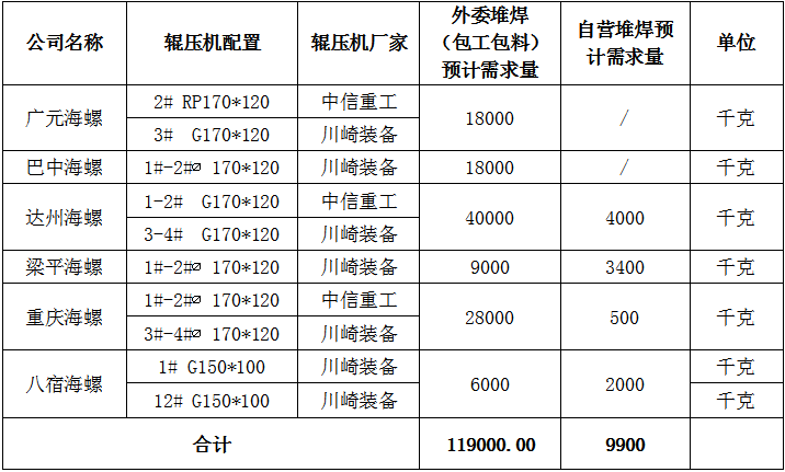 2.標(biāo)的數(shù)量:?輥面堆焊焊絲(包工包料)年預(yù)計需求119噸;?耐磨焊絲年預(yù)計需求9.9噸;預(yù)計采購總額約813.10萬元,實(shí)際以各公司最終需求數(shù)量為準(zhǔn)。