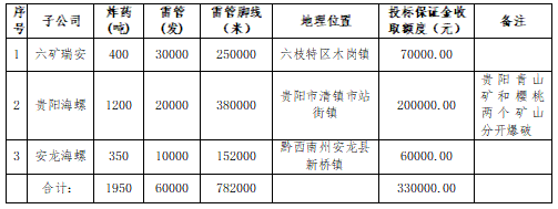 備注:六礦瑞安免費提供炸藥庫2個(核載10噸)、雷管庫1個(核載2萬發(fā))、炸藥車1輛(核載5噸),投標單位報價需綜合考慮以上情況。若中標需負責辦理炸藥庫租賃和炸藥車掛靠手續(xù),并承擔辦理所產生的一切費用。合同到期后負責將炸藥庫和炸藥車轉至我公司或新中標渠道,并承擔所產生的一切費用。
