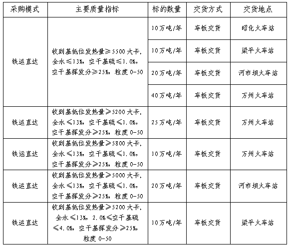 2.鐵路直達(dá)(梁平高硫煤)定價原則:參照鐵路直達(dá)煙煤年度長協(xié)到站價格為基準(zhǔn),折算成合同標(biāo)準(zhǔn)熱值標(biāo)準(zhǔn)后,下浮**元/噸(下浮不得低于10元/噸,由投標(biāo)單位填報(bào))確定當(dāng)月煤炭供貨價格。