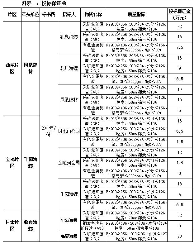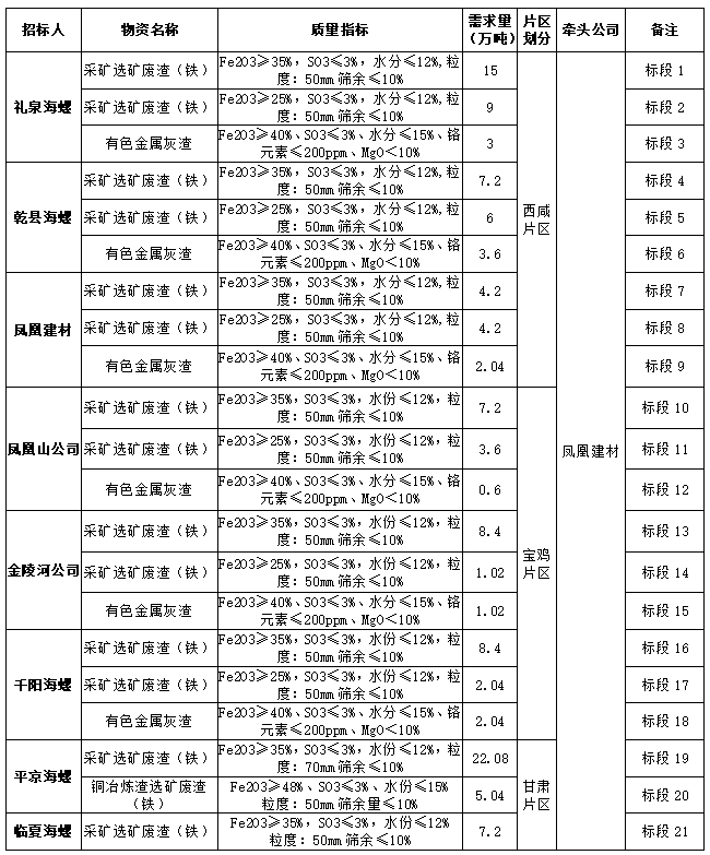 根據(jù)2022年度禮泉海螺、平?jīng)龊B?、千陽海螺、乾縣海螺、臨夏海螺、鳳凰建材、金陵河公司、鳳凰山公司等8家公司生產(chǎn)經(jīng)營計(jì)劃,現(xiàn)對2022年度鐵質(zhì)材料(直供)采購組織招標(biāo),為進(jìn)一步體現(xiàn)公平、公正、公開透明的原則,此次招標(biāo)將在安徽海螺水泥股份有限公司陽光采購平臺公開進(jìn)行,現(xiàn)將招標(biāo)采購信息發(fā)布如下: