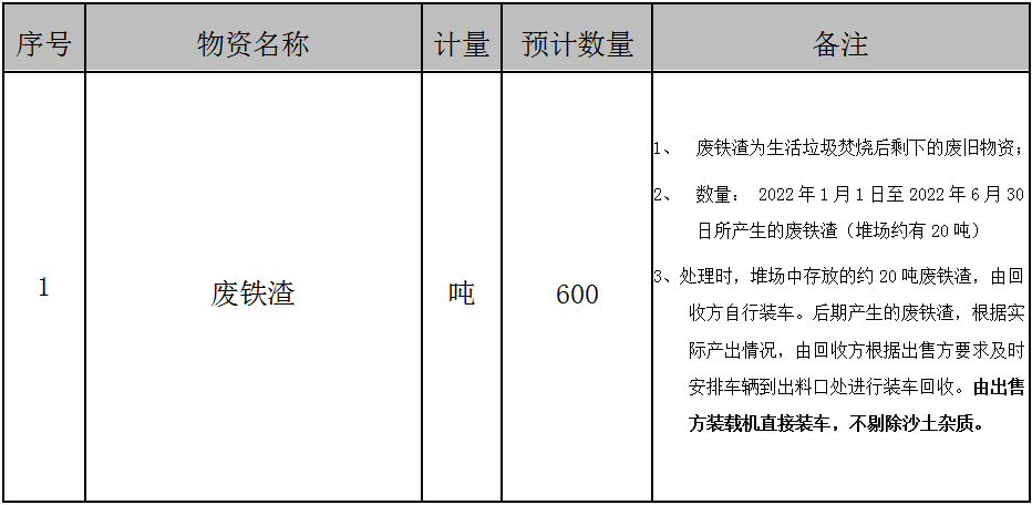 2.廢鐵渣為生活垃圾焚燒系統(tǒng)焚燒后的廢舊物資,從中標(biāo)日起截止2022年6月30日期間垃圾焚燒所產(chǎn)生的廢鐵渣,均由中標(biāo)單位根據(jù)招標(biāo)方要求分批次進(jìn)行回收,不做現(xiàn)場篩選,直接裝車過磅,所產(chǎn)生的一切費用包含在投標(biāo)報價內(nèi)。