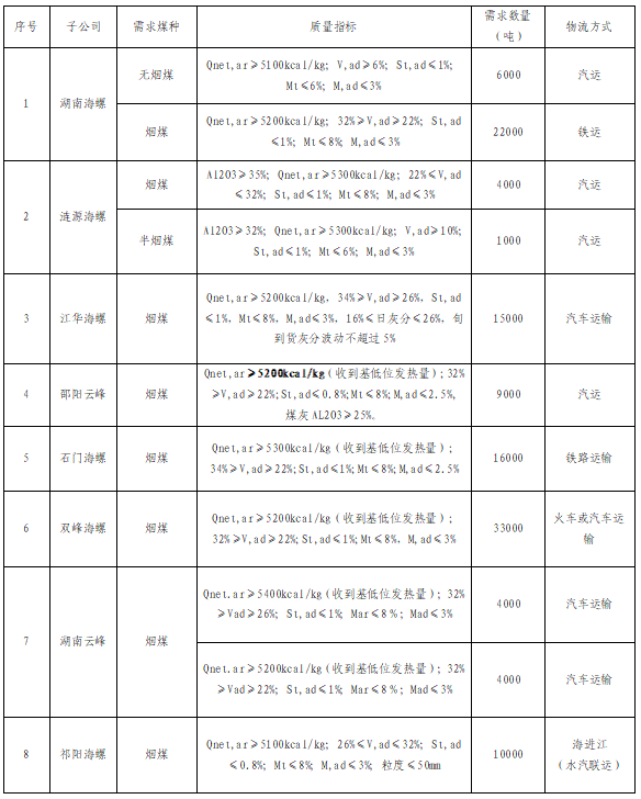 根據(jù)2022年2月21日-2022年3月20日海螺水泥湖南區(qū)域各子公司煤炭需求,現(xiàn)擬對煤炭進行公開招標,選定中標人,為體現(xiàn)公平、公正、公開的原則,拓寬采購渠道,現(xiàn)將招標相關事宜公告如下:
