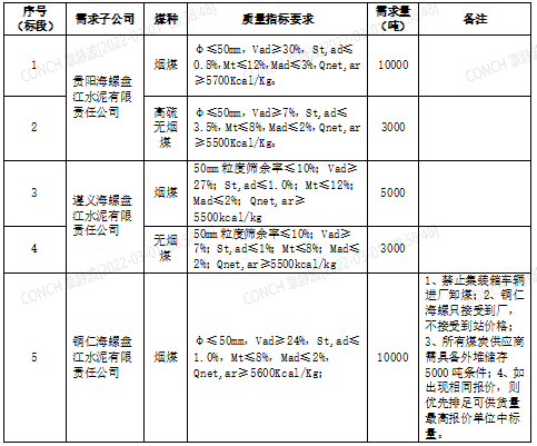 海螺水泥貴州區(qū)域擬對2022年3月21日至2022年4月20日生產用煤炭進行公開招標,選定中標單位,現(xiàn)將相關招標事宜公示如下: