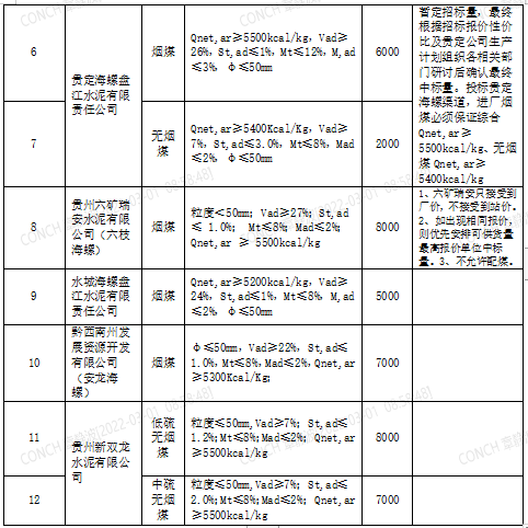 5.若2022年3月21日-2022年4月20日貴州區(qū)域煤炭招標報名單位同為2022年2月21日—2022年3月20日中標單位,中標單位在執(zhí)行合同供貨量在2022年3月6日24時前(銷發(fā)系統(tǒng)進廠數(shù)量)小于合同約定量的30%的,不予以參與海螺水泥貴州區(qū)域2022年3月21日至2022年4月20日煤炭招標(僅買方原因或不可抗力因素除外,鐵路在途和在站煤炭不給予納入供貨量,僅以進廠數(shù)量為準),并取消在貴州區(qū)域所有海螺6個月內的投標資格。