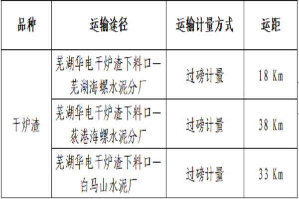 4、承運量:預(yù)計粉煤灰總承運量為40萬噸、脫硫石膏總承運量為16萬噸、干爐渣總承運量為5萬噸(該承運數(shù)量暫定以華電2022年度投標(biāo)活動最大中標(biāo)數(shù)量,合同數(shù)量為蕪湖華電中標(biāo)數(shù)量,最終結(jié)算以華電實際產(chǎn)出量為準(zhǔn))。