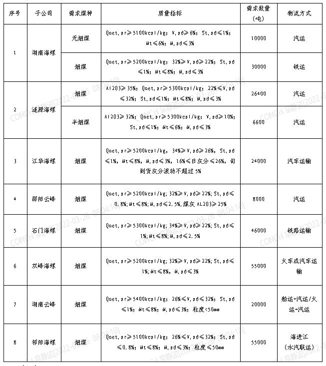 根據(jù)2022年4月21日-2022年5月20日海螺水泥湖南區(qū)域各子公司煤炭需求,現(xiàn)擬對煤炭進(jìn)行公開招標(biāo),選定中標(biāo)人,為體現(xiàn)公平、公正、公開的原則,拓寬采購渠道,現(xiàn)將招標(biāo)相關(guān)事宜公告如下: