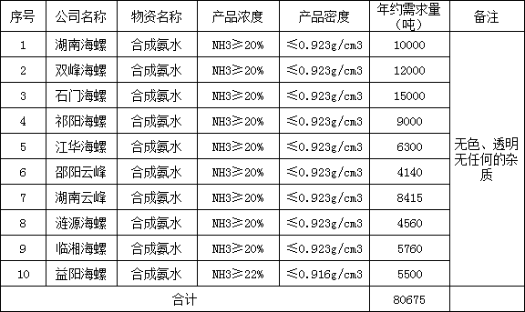 1、標(biāo)的內(nèi)容:合成氨水NH3≥20%、密度≤ 0.923g/cm3(其中益陽海螺合成氨水NH3≥22%、、密度≤ 0.916g/cm3),產(chǎn)品質(zhì)量應(yīng)符合國家工業(yè)氨水標(biāo)準(zhǔn)HG1-88-81《氨水》;