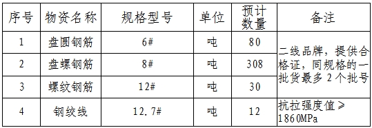 3.本次招標(biāo)要求投標(biāo)人公司經(jīng)營范圍需涵蓋鋼材、金屬材料、預(yù)應(yīng)力鋼絞線生產(chǎn)或銷售資質(zhì),具備獨立承擔(dān)民事責(zé)任能力。