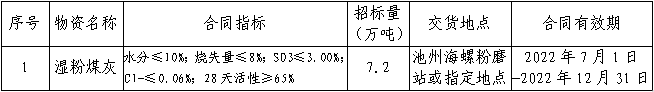 根據(jù)池州公司水泥生產(chǎn)經(jīng)營(yíng)需求,安徽池州海螺水泥股份有限公司將對(duì)2022年7月1日-2022年12月31日合同期濕粉煤灰開展采購(gòu)招標(biāo)工作,為進(jìn)一步體現(xiàn)公開、公平、公正的原則,現(xiàn)將相關(guān)事宜公告如下: