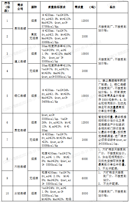 海螺水泥貴州區(qū)域擬對(duì)2022年6月21日至2022年7月20日生產(chǎn)用煤炭進(jìn)行公開(kāi)招標(biāo),選定中標(biāo)單位,現(xiàn)將相關(guān)招標(biāo)事宜公示如下: