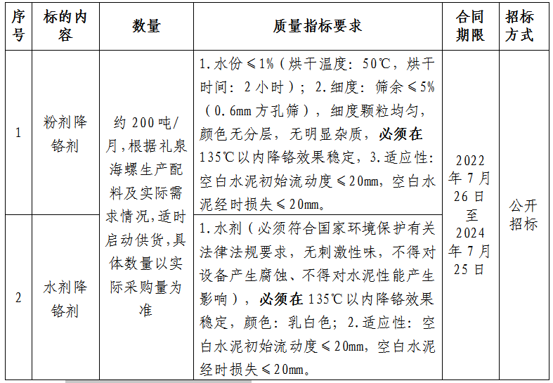 根據(jù)禮泉海螺生產(chǎn)需求,擬對2022-2024年度降鉻劑進行公開招標,為進一步體現(xiàn)“公平、公正、公開”的原則,此次招標在安徽海螺水泥股份有限公司陽光采購平臺公開進行?,F(xiàn)將招標采購信息發(fā)布如下: