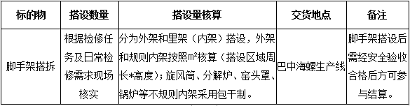根據巴中海螺生產經營需求,為保障回轉窯、水泥磨及生產設備實施檢修期間的施工安全、質量和進度受控,部分區(qū)域需搭設腳手架。為確保腳手架搭設業(yè)務開展的合規(guī)性,本著公平、公正、公開、透明的原則,現(xiàn)將招標相關事宜公告如下: