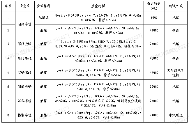 根據(jù)2022年8月21日-2022年9月20日海螺水泥湖南區(qū)域各子公司煤炭需求,現(xiàn)擬對煤炭進行公開招標,選定中標人,為體現(xiàn)公平、公正、公開的原則,拓寬采購渠道,現(xiàn)將招標相關(guān)事宜公告如下: