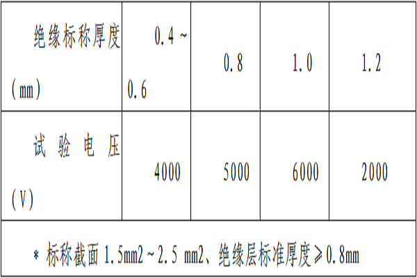 絕緣線芯應(yīng)經(jīng)受下表規(guī)定的交流50Hz電壓火花試驗。(火花試驗應(yīng)保證絕緣每點(diǎn)上經(jīng)受電壓的作用時間不少于0.2s)。