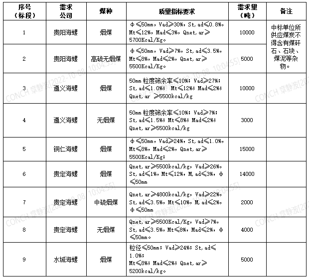 海螺水泥貴州區(qū)域擬對2022年10月21日至2022年11月20日生產(chǎn)用煤炭進行公開招標,選定中標單位,現(xiàn)將相關招標事宜公示如下: