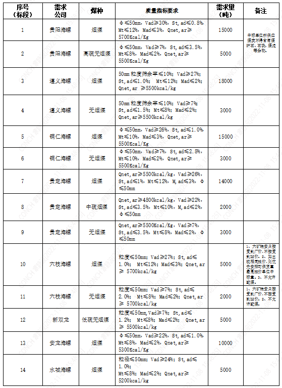 海螺水泥貴州區(qū)域擬對2022年11月21日至2022年12月20日生產(chǎn)用煤炭進(jìn)行公開招標(biāo),選定中標(biāo)單位,現(xiàn)將相關(guān)招標(biāo)事宜公示如下: