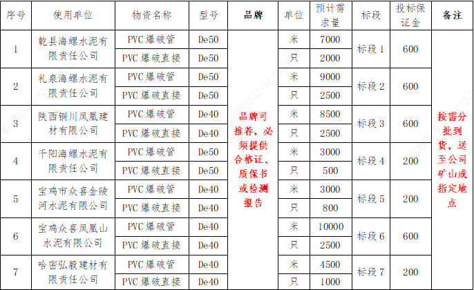 2.交貨地點(diǎn):禮泉海螺、乾縣海螺、鳳凰山公司、金陵河公司、千陽海螺、鳳凰建材、哈密公司等7家公司礦山或指定地點(diǎn)。