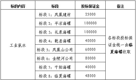 本次氨水招標(biāo)分臨夏海螺、禮泉海螺、乾縣海螺、鳳凰山公司、金陵河公司、千陽海螺、平?jīng)龊B?、鳳凰建材8個(gè)標(biāo)段,若投標(biāo)人只投一個(gè)標(biāo)段(臨夏海螺標(biāo)段、禮泉海螺標(biāo)段、乾縣海螺標(biāo)段、鳳凰山公司標(biāo)段、金陵河公司標(biāo)段、千陽海螺標(biāo)段、平?jīng)龊B輼?biāo)段、鳳凰建材標(biāo)段),則只需繳納對(duì)應(yīng)標(biāo)段的投標(biāo)保證金,若投標(biāo)2個(gè)及以上標(biāo)段則按照對(duì)應(yīng)標(biāo)段投標(biāo)保證金累加計(jì)算并繳納,匯款需注明具體投標(biāo)的標(biāo)段。