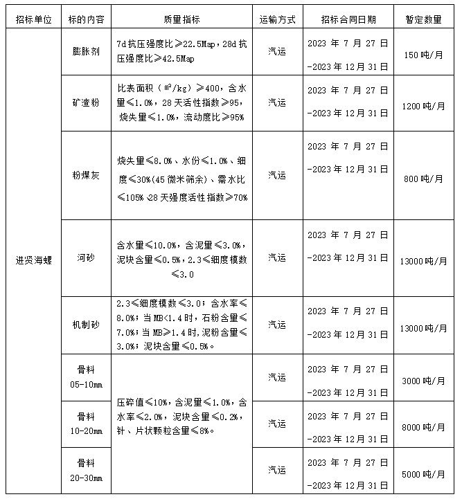 6、投標保證金繳納:已下載標書的投標單位應在2023年7月25日10:00分標段繳納投標保證金,其中膨脹劑標段投標保證金1萬元,粉煤灰標段投標保證金1萬元,礦渣粉標段投標保證金4萬元,河砂標段投標保證金13萬元,機制砂標段投標保證金10萬元,骨料標段投標保證金13萬元(未取得供應權單位待招標工作結束后5個工作日將及時無息退還)。