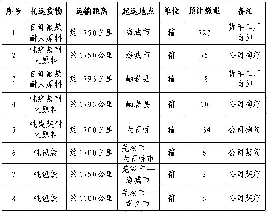 1.2起止地點(diǎn):原料裝運(yùn)起點(diǎn)為遼寧省海城市/岫巖縣/大石橋市供貨單位指定裝貨倉(cāng)庫(kù)—終點(diǎn)安徽海螺暹羅耐火材料公司倉(cāng)庫(kù);噸袋裝運(yùn)為海螺耐火材料公司倉(cāng)庫(kù)至大石橋市、海城市、孝義市。