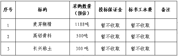 根據(jù)高鋁磚及堿性磚分廠2023年10-12月份產品生產計劃,結合前期麥芽糊精、高鋁骨料、粘土等3類原材料合同執(zhí)行及庫存消耗情況,為保證生產所需原材料有序銜接,同時進一步降低采購成本,現(xiàn)本著“公開、公平、公正、透明”的原則公開招標,誠邀經營資質能力較好、保供和服務能力較強的單位參加投標?,F(xiàn)就招標相關事項公示如下: