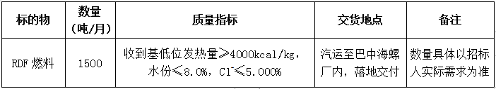 根據(jù)巴中海螺生產(chǎn)經(jīng)營需求,現(xiàn)對RDF燃料采購業(yè)務(wù)進(jìn)行公開招標(biāo),本著公平、公正、公開、透明的原則,現(xiàn)將招標(biāo)相關(guān)事宜公示如下: