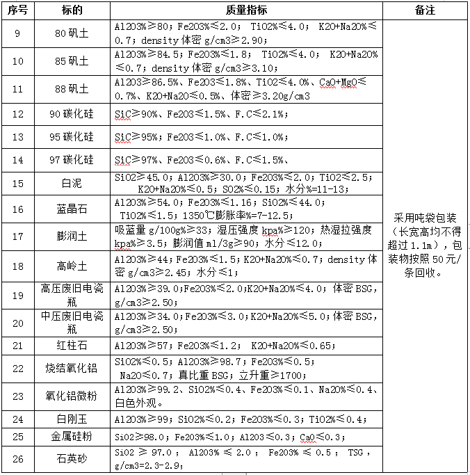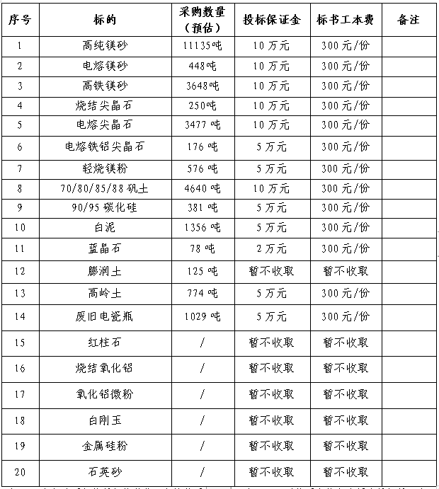 4、上述88礬土、97碳化硅、紅柱石、燒結(jié)氧化鋁、白剛玉、金屬硅粉和石英砂等招標(biāo)采購原材料,因采購量不確定,本次招標(biāo)僅作為本公司采購備用原材料??紤]上述原材料存在無執(zhí)行情況,投標(biāo)保證金、標(biāo)書工本費和合同履約保證金暫不收取。