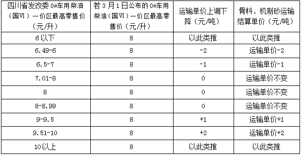 2.本次招標(biāo)運(yùn)輸費(fèi)用為運(yùn)輸?shù)綇S卸貨所發(fā)生的一切費(fèi)用。運(yùn)價(jià)在合同期內(nèi)執(zhí)行油價(jià)與運(yùn)價(jià)聯(lián)動(dòng)機(jī)制的運(yùn)輸招標(biāo):以四川省發(fā)改委2024年3月1日公布的0#車用柴油(國(guó)Ⅵ)一價(jià)區(qū)最高零售價(jià)***元/升作為油價(jià)聯(lián)動(dòng)基準(zhǔn)價(jià),如在合同期內(nèi)四川省發(fā)改委公布0#車用柴油(國(guó)Ⅵ)一價(jià)區(qū)最高零售價(jià)格(以下簡(jiǎn)稱:公布最新油價(jià))漲跌幅度超過(guò)1元/升,啟動(dòng)油價(jià)聯(lián)動(dòng),調(diào)整日期與四川省發(fā)改委公布油價(jià)調(diào)整日期同步。具體方式為:①若合同期內(nèi)公布最新油價(jià)較基準(zhǔn)價(jià)上調(diào)或下降幅度小于等于1元/L,則運(yùn)輸費(fèi)用不作調(diào)整;②若合同期內(nèi)公布最新油價(jià)較基準(zhǔn)價(jià)漲跌幅度大于1元/L,小于等于1.5元/L,則運(yùn)輸費(fèi)用在合同價(jià)基礎(chǔ)上上調(diào)或下降1元/噸;③若合同期內(nèi)公布最新油價(jià)較基準(zhǔn)價(jià)漲跌幅度大于1.5元/L,小于等于2元/L,則運(yùn)輸費(fèi)用在合同價(jià)基礎(chǔ)上上調(diào)或下降2元/噸,以次類推。