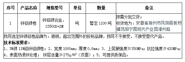 1、招標物資信息:宣城海螺建筑光伏公司2024年3月-2024年6月生產(chǎn)用鋅鎂鋁卷(根據(jù)項目結束時間)。