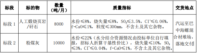 備注:標(biāo)段2可選擇目錄為“粉煤灰(粗)、濕粉煤灰、燃爐煤渣”等中的一種,也可根據(jù)自身資源填報(bào)其他物資名稱,質(zhì)量必須滿足招標(biāo)方使用,其中濕粉煤灰水分最高不高于22%,其他品種粉煤灰水分最高不高于10%,不設(shè)下限,合同質(zhì)量指標(biāo)及質(zhì)量結(jié)算條款參照標(biāo)段2執(zhí)行。