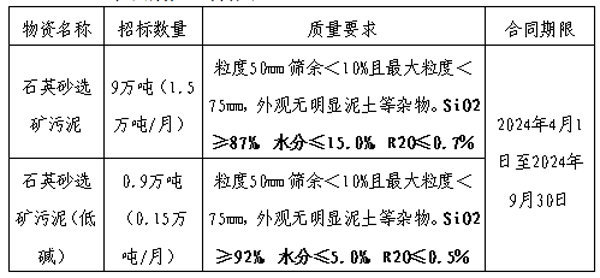 投標人在報價時應綜合考慮石英砂選礦污泥生產(chǎn)、運輸過程中一切不確定因素,以及我公司要求的硅含量、堿含量等質量指標,合理報價。合同期內(nèi)價格固定不變。兩種質量石英砂選礦污泥分標段分別評標,按各標段最低價原則選擇中標單位。