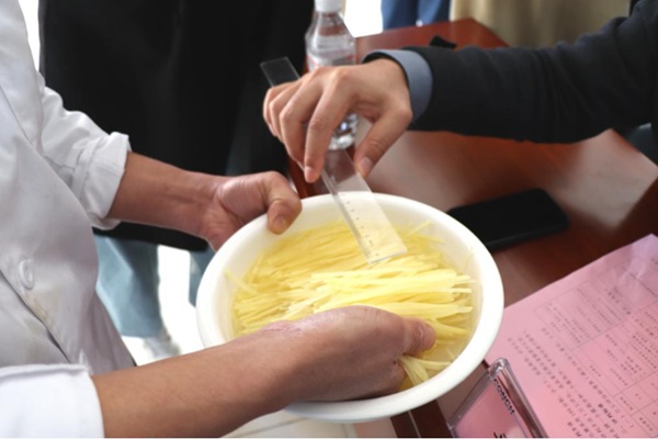 大賽初始,刀工競技率先驚艷全場。參賽者們各顯神通,一把把菜刀在他們手中仿若靈動的畫筆,食材則幻化為精美畫布。只見廚師們手法嫻熟、運刀似疾風(fēng)閃電,將土豆穩(wěn)穩(wěn)置于案板之上,鋒利的刀刃輕觸土豆,隨后便開始了令人驚嘆的切絲表演。那切出的土豆絲細(xì)如發(fā)絲,且經(jīng)測量,根根粗細(xì)均勻,毫厘之差盡顯超凡控制力與精湛技藝?!巴?,此技堪稱一絕,這也太厲害了!”現(xiàn)場觀眾紛紛為廚師們的高超刀工所折服,驚嘆之聲此起彼伏,仿佛在觀賞一場精彩絕倫的指尖藝術(shù)表演。
