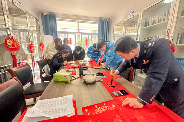 活動(dòng)現(xiàn)場(chǎng),墨香四溢,紅紙翻飛。來(lái)自書(shū)法協(xié)會(huì)的書(shū)法家們與稅務(wù)局的書(shū)法愛(ài)好者們齊聚一堂,揮毫潑墨,一展書(shū)法技藝。不一會(huì)兒,一幅幅精心創(chuàng)作又寓意吉祥、飽含祝福的春聯(lián)便鋪滿(mǎn)了桌面。“歲歲常歡愉,年年皆勝意”“生活自在心澎湃,萬(wàn)物可愛(ài)多期待”“盛世和諧添錦繡,新春如意滿(mǎn)吉祥”。一幅幅對(duì)仗工整、字體優(yōu)美的春聯(lián)躍然紙上,不僅為即將到來(lái)的春節(jié)增添了濃濃的喜慶氛圍,也傳遞著對(duì)美好生活的向往和祝福。