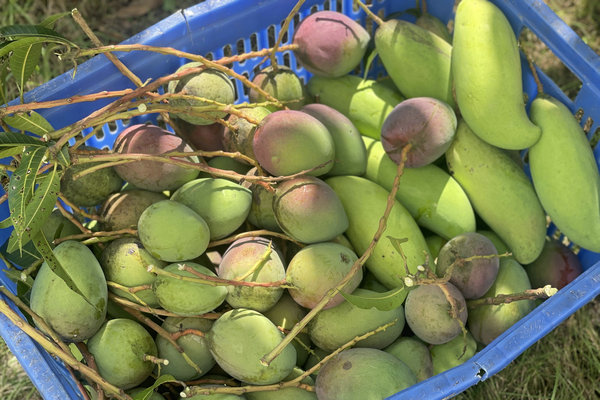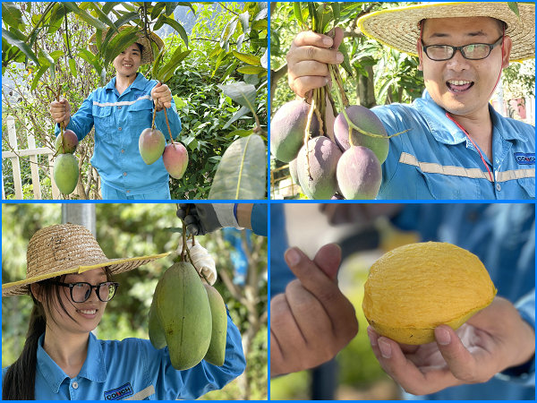 “瞧瞧這大家伙,一個(gè)頂倆!比我的臉還大!”一位員工提起起沉甸甸的金煌芒,笑容如芒果般飽滿。旁邊經(jīng)驗(yàn)豐富的“芒果之鄉(xiāng)”田東縣的同事邊剪邊傳授:“蒂把留一小截,果子更耐放。”新加入的年輕員工起初動(dòng)作略顯生澀,然而幾番嘗試后也漸入佳境,笨拙卻認(rèn)真,汗水混著笑意,映著陽光。銷售處的馮姐捧著自己摘下的貴妃芒,嗅著那獨(dú)特的馥郁香氣,不禁感嘆:“這香氣,比賬本上的數(shù)字更令人心甜呢!”